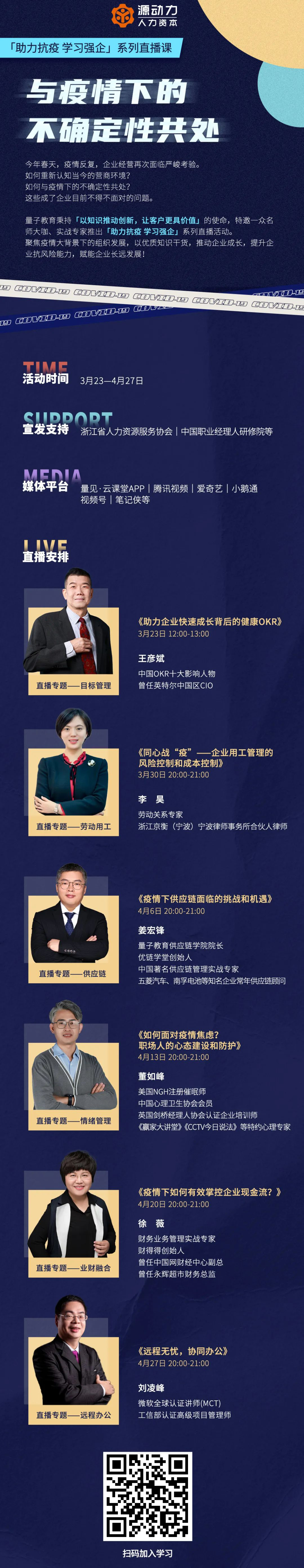 量子教育攜手一眾名師大咖、實戰(zhàn)專家聚焦疫情大背景下的組織發(fā)展,推出「助力抗疫 學(xué)習(xí)強(qiáng)企」系列直播活動,通過企業(yè)目標(biāo)管理、情緒管理、勞動用工、業(yè)財融合、遠(yuǎn)程辦工、供應(yīng)鏈等多個維度提升企業(yè)抗風(fēng)險能力,賦能企業(yè)長遠(yuǎn)發(fā)展!